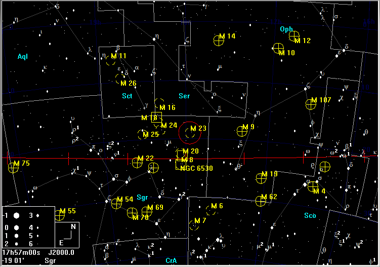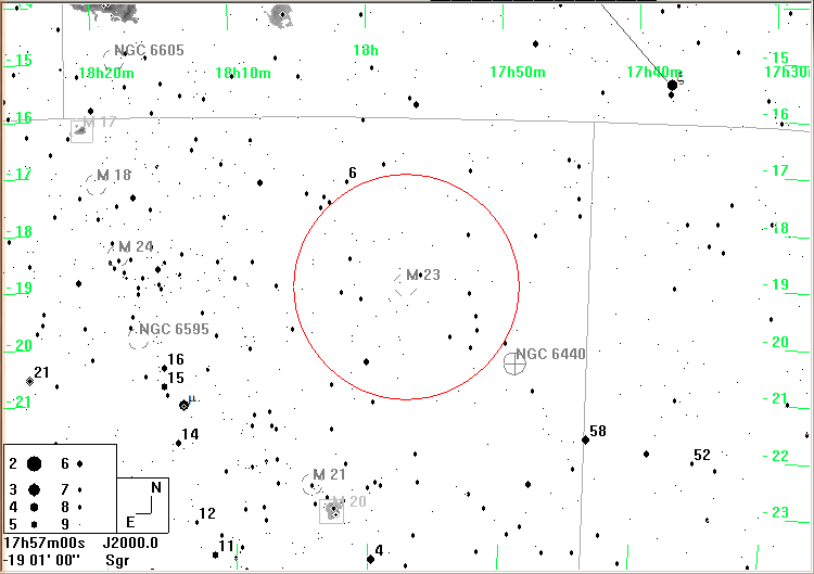 Scan SE 6° from ξ Ser, in the direction of μ Sgr. M23 should lie within the field of view.