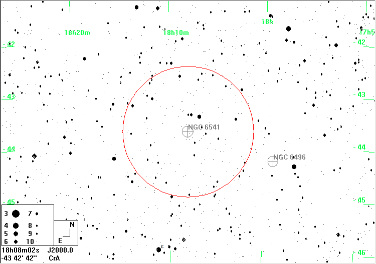 NGC 6541 is a large, bright object, that is easy in 10×50 binoculars. More of a challenge is the nearby NGC 6496, nearly 2° to the WSW, which is about half the size and a quarter of the brightness. The 5th magnitude star nearly half a degree to the WSW of the fainter cluster can be an aid to locating it when sky conditions are less than ideal.