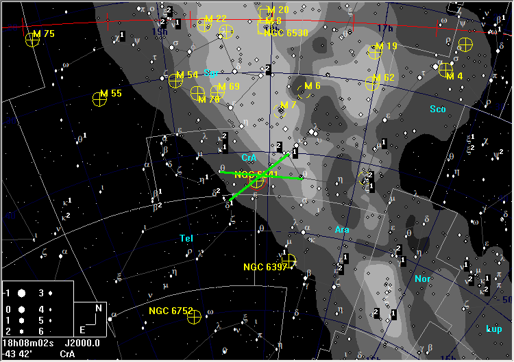 NGC 6541 is about a quarter of a field SE of the point where a line from θ CrA to θ Sco crosses a line from α Tel to ι1 Sco.